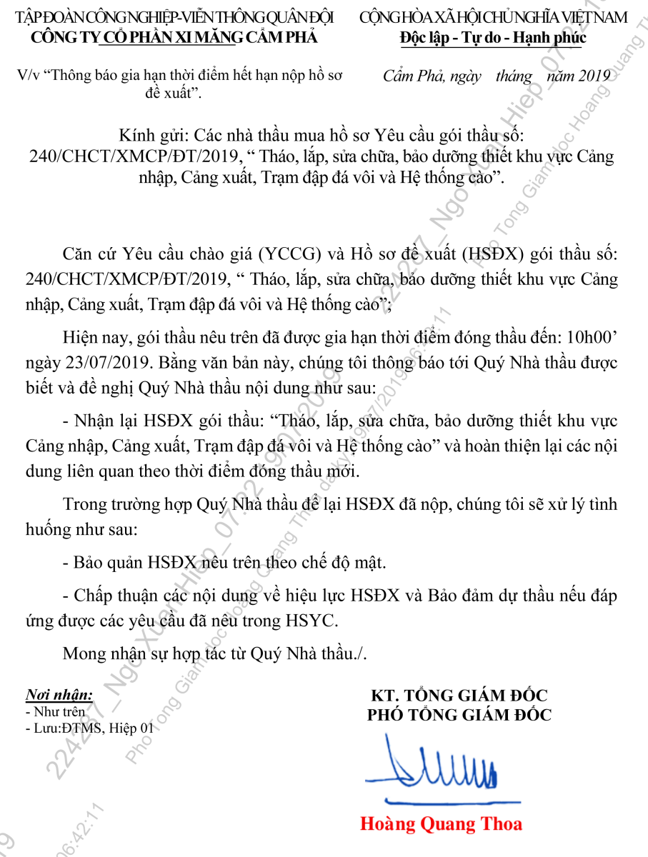 Gia hạn thời điểm hết hạn nộp hồ sơ đề xuất gói thầu tháo lắp, sửa chữa, bảo dưỡng thiết bị khu vực cảng nhập, cảng xuất, trạm đập đá vôi và hệ thống cào