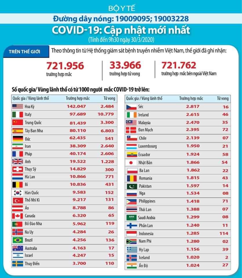 Hiện nay tình hình dịch, bệnh Covid – 19 vẫn đang lây truyền mạnh trên thế giới, nhất là một số nước như: Mỹ, Italy, Pháp,… Trên thế giới có 721.956 người nhiễm; có 33.966 trường hợp đã tử vong. Theo thông báo của Bộ y tế, đến 9h30 sáng ngày 30/03/2020 tại Việt Nam đã có 194 người mắc. Dịch bệnh đang tiếp tục diễn biến theo chiều hướng phức tạp, khó lường, số ca mắc bệnh và dương tính với Covid – 19 vẫn có xu hướng gia tăng.