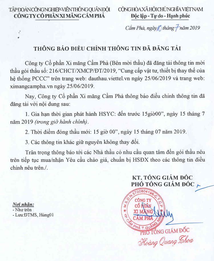 Thông báo điều chỉnh thông tin đã đăng tải gói thầu Cung cấp vật tư, thiết bị thay thế hệ thống PCCC