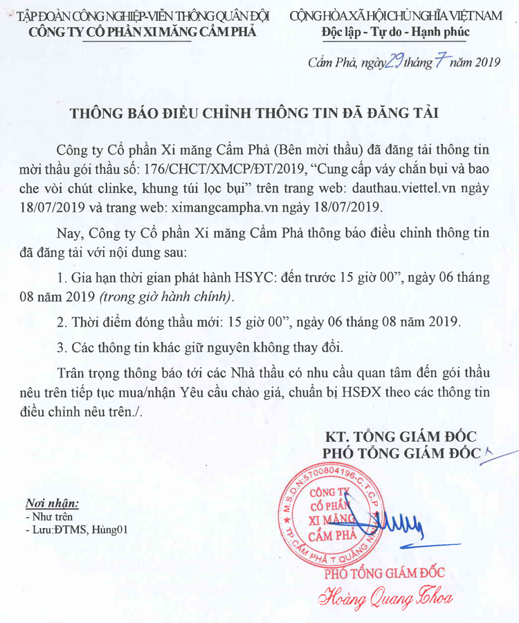 Thông báo điều chỉnh thông tin đã đăng tải gói thầu cung cấp váy chắn bụi và bao che vòi chút clinke, khung túi lọc bụi