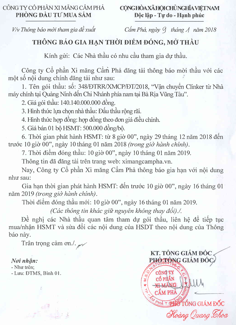 Thông báo gia hạn thời điểm đóng, mở thầu gói thầu vận chuyển Clinker
