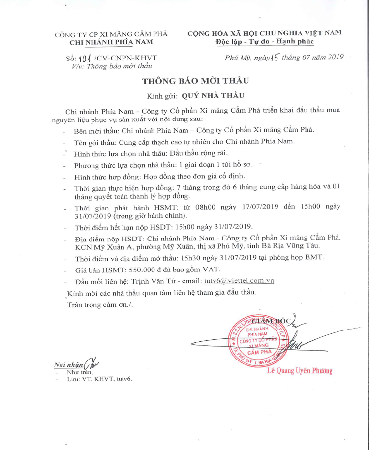 Thông báo mời tham gia cung cấp thạch cao tự nhiên cho Chi nhánh phía Nam - Công ty CP Xi măng Cẩm Phả