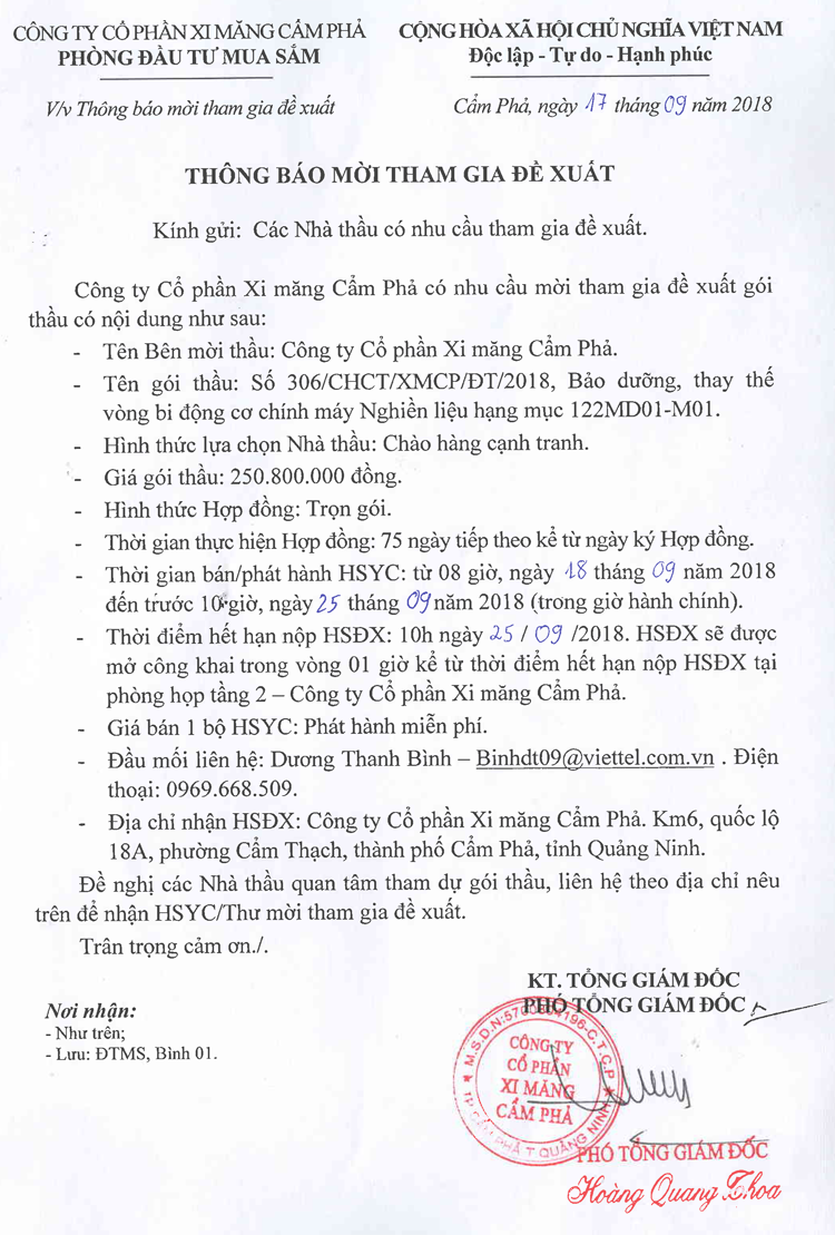 Thông báo mời tham gia đề xuất bảo dưỡng, thay thế vòng bi động cơ chính máy nghiền