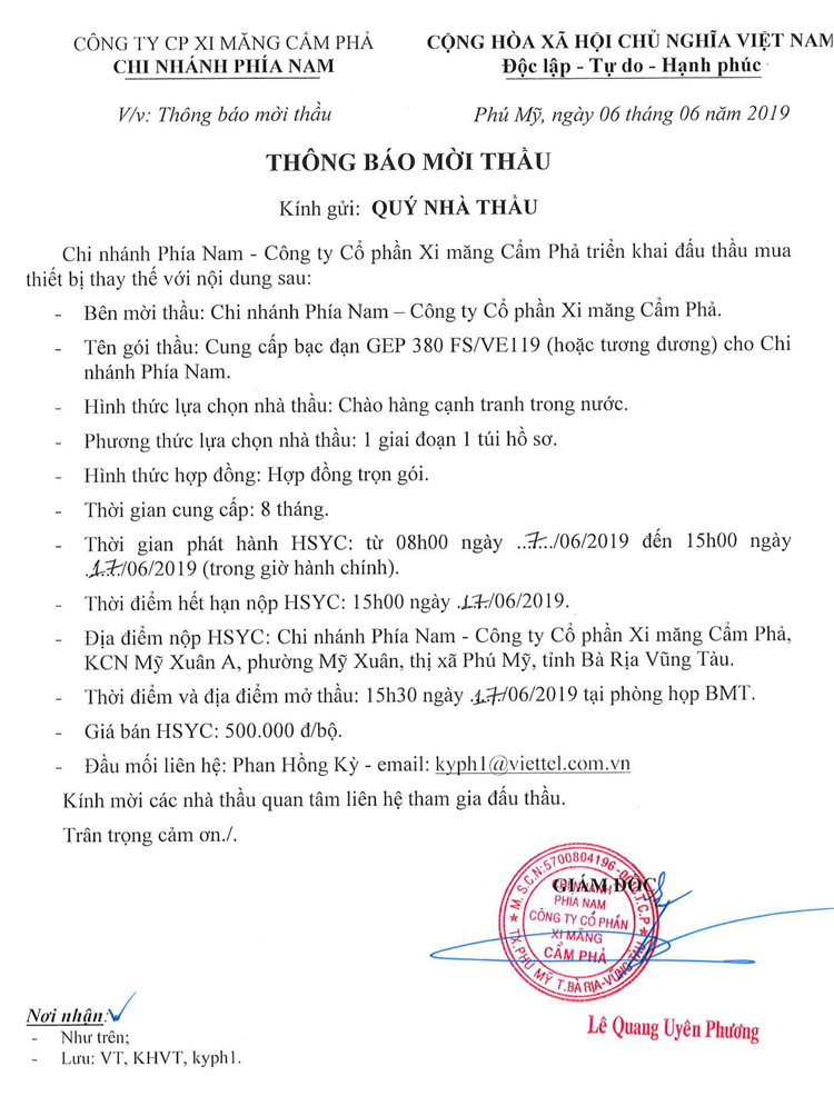 Thông báo mời tham gia đề xuất cung cấp bạc đạn GEP 380 FS/VE119 (hoặc tương đương) cho Chi nhánh phía Nam