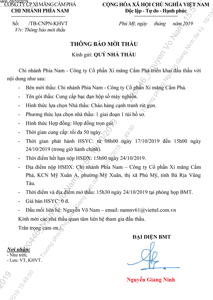 Thông báo mời tham gia đề xuất Cung cấp bạc đạn hộp số máy nghiền