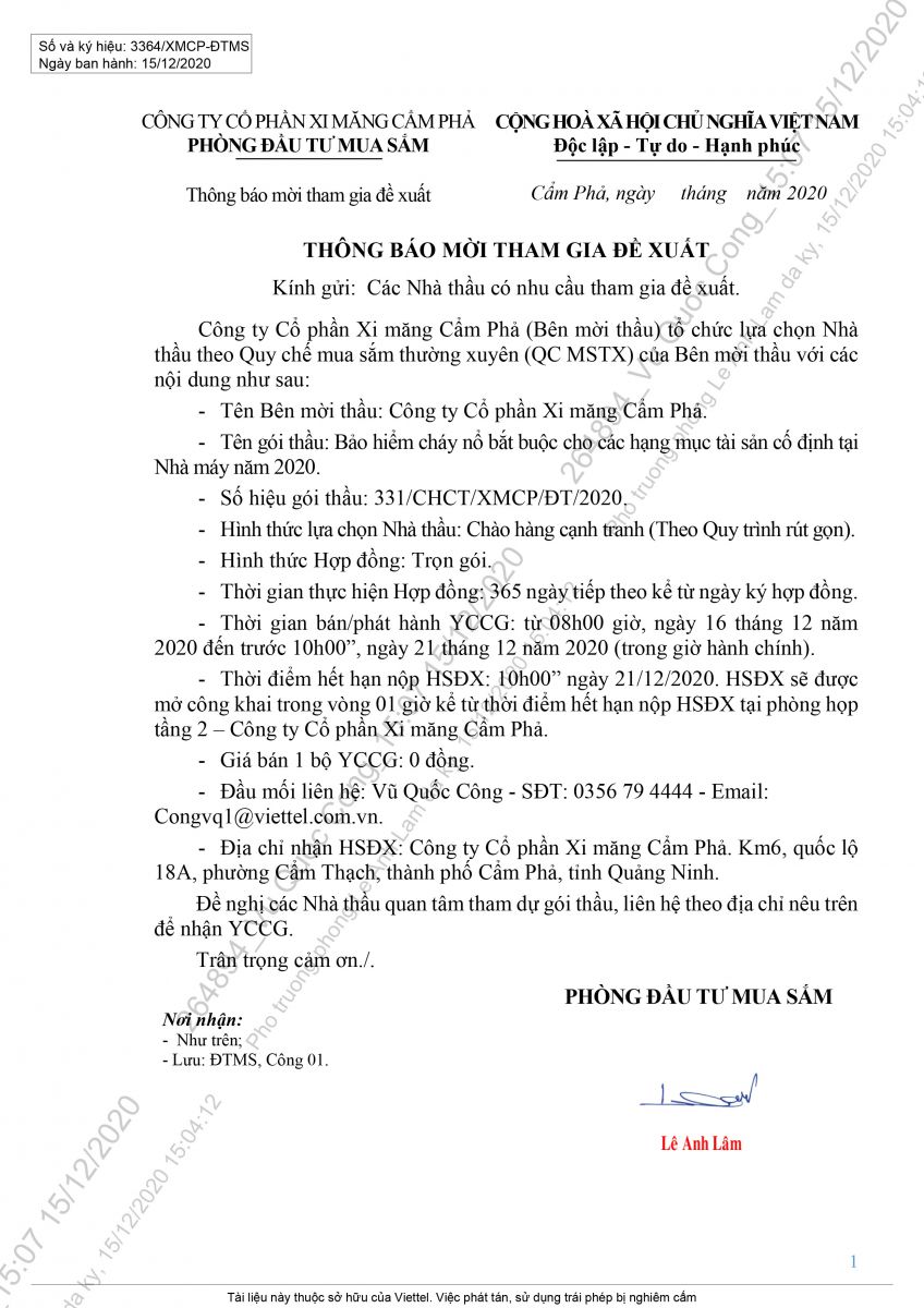 Thông báo mời tham gia đề xuất cung cấp bảo hiểm cháy nổ bắt buộc cho các hạng mục tài sản cố định tại nhà máy năm 2020