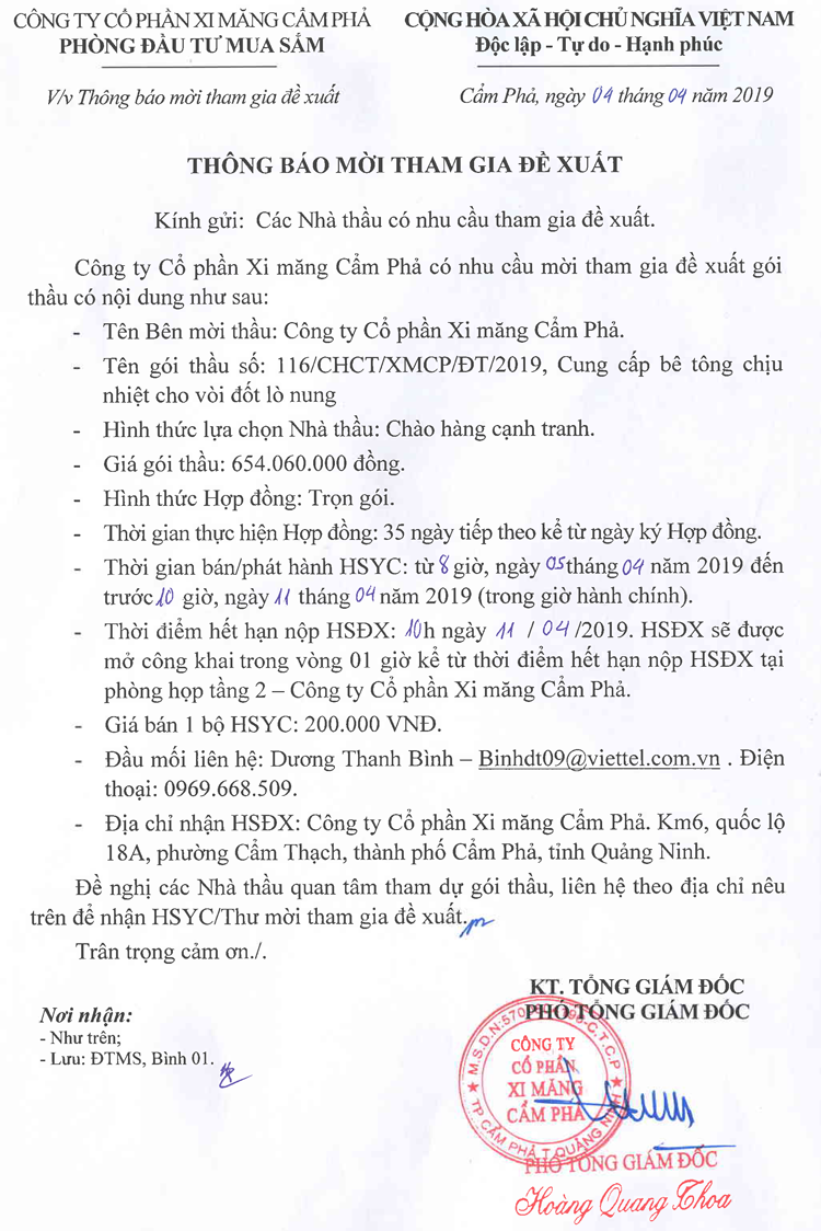 Thông báo mời tham gia đề xuất cung cấp bê tông chịu nhiệt cho vòi đốt lò nung