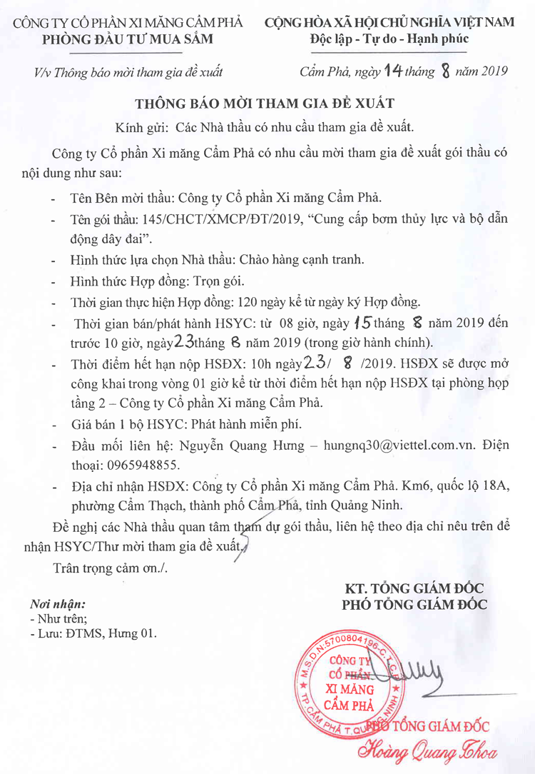 Thông báo mời tham gia đề xuất Cung cấp bơm thủy lực và bộ dẫn động dây đai