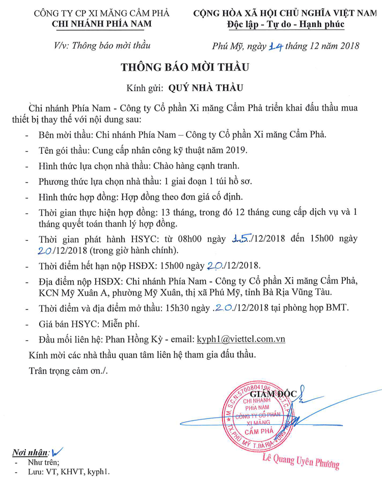 Thông báo mời tham gia đề xuất cung cấp công nhân kỹ thuật năm 2019