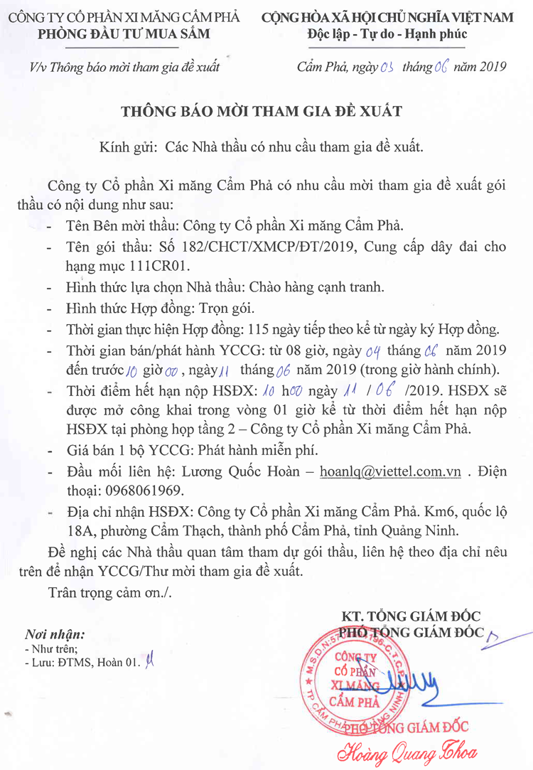 Thông báo mời tham gia đề xuất cung cấp dây đai cho hạng mục 111CR01