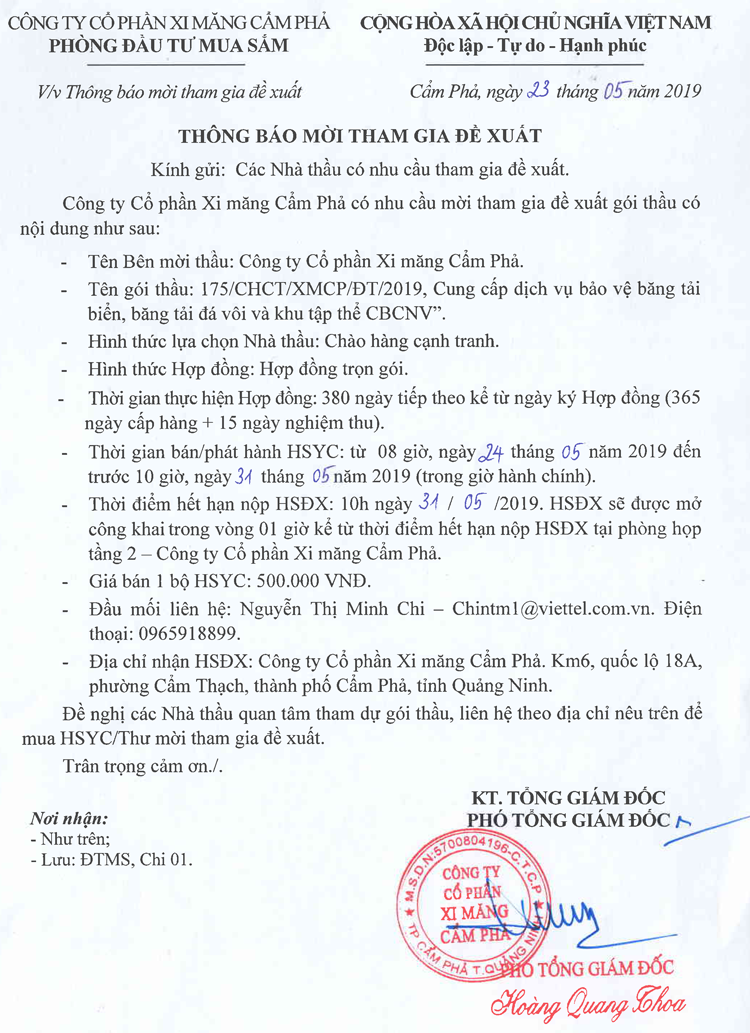 Thông báo mời tham gia đề xuất cung cấp dịch vụ bảo vệ băng tải biển, băng tải đá vôi và khu tập thể CBCNV