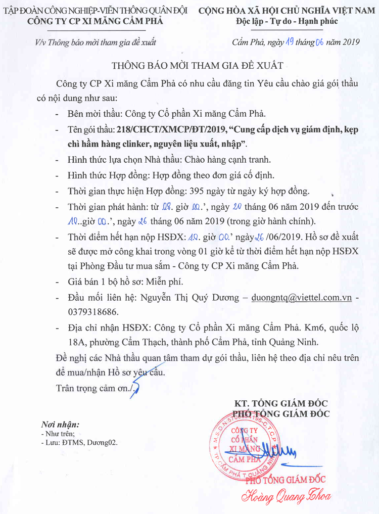 Thông báo mời tham gia đề xuất cung cấp dịch vụ giám định, kẹp chì hầm hàng clinker, nguyên liệu xuất, nhập
