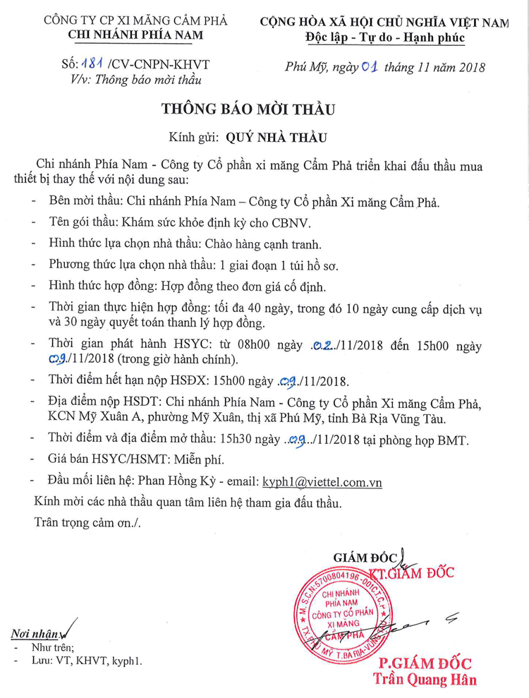 Thông báo mời tham gia đề xuất cung cấp dịch vụ khám sức khỏe định kỳ cho CBCNV Chi nhánh phía Nam