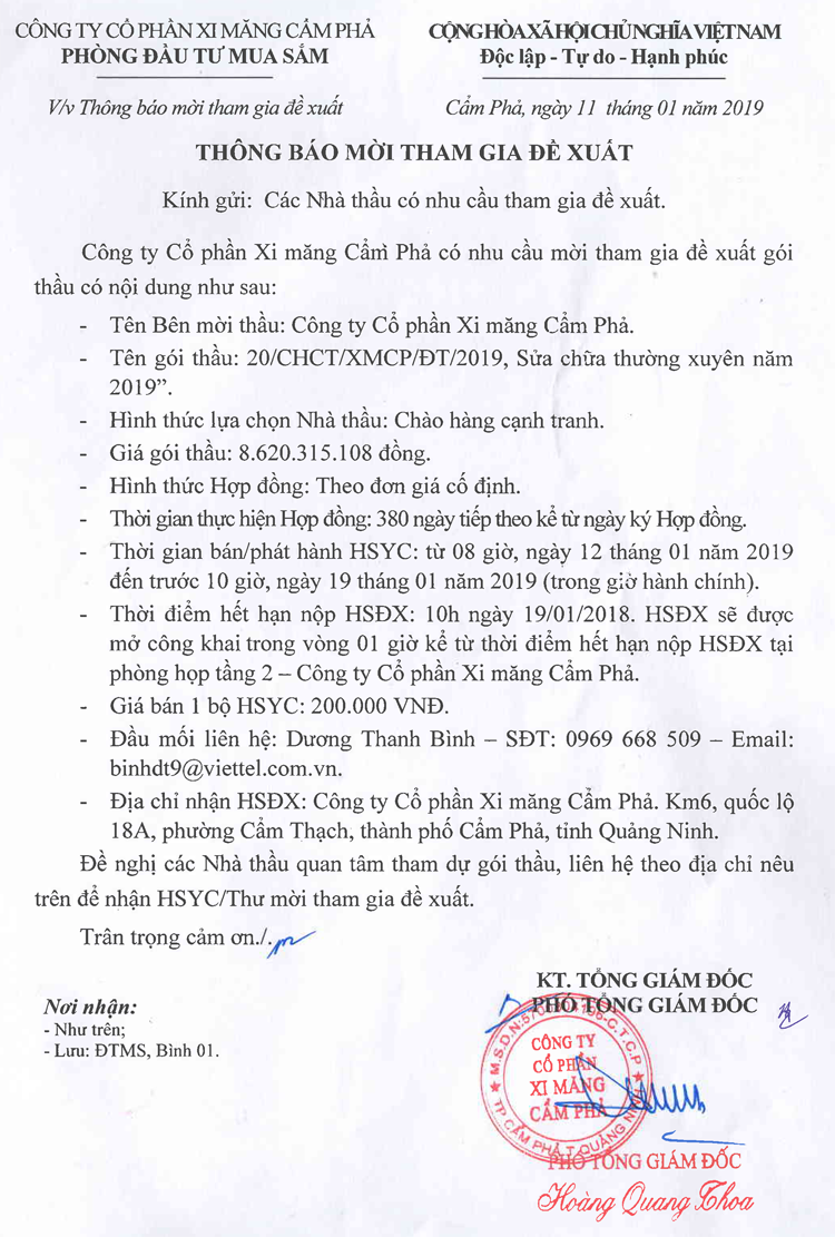 Thông báo mời tham gia đề xuất cung cấp dịch vụ sửa chữa thường xuyên năm 2019 tại Nhà máy chính