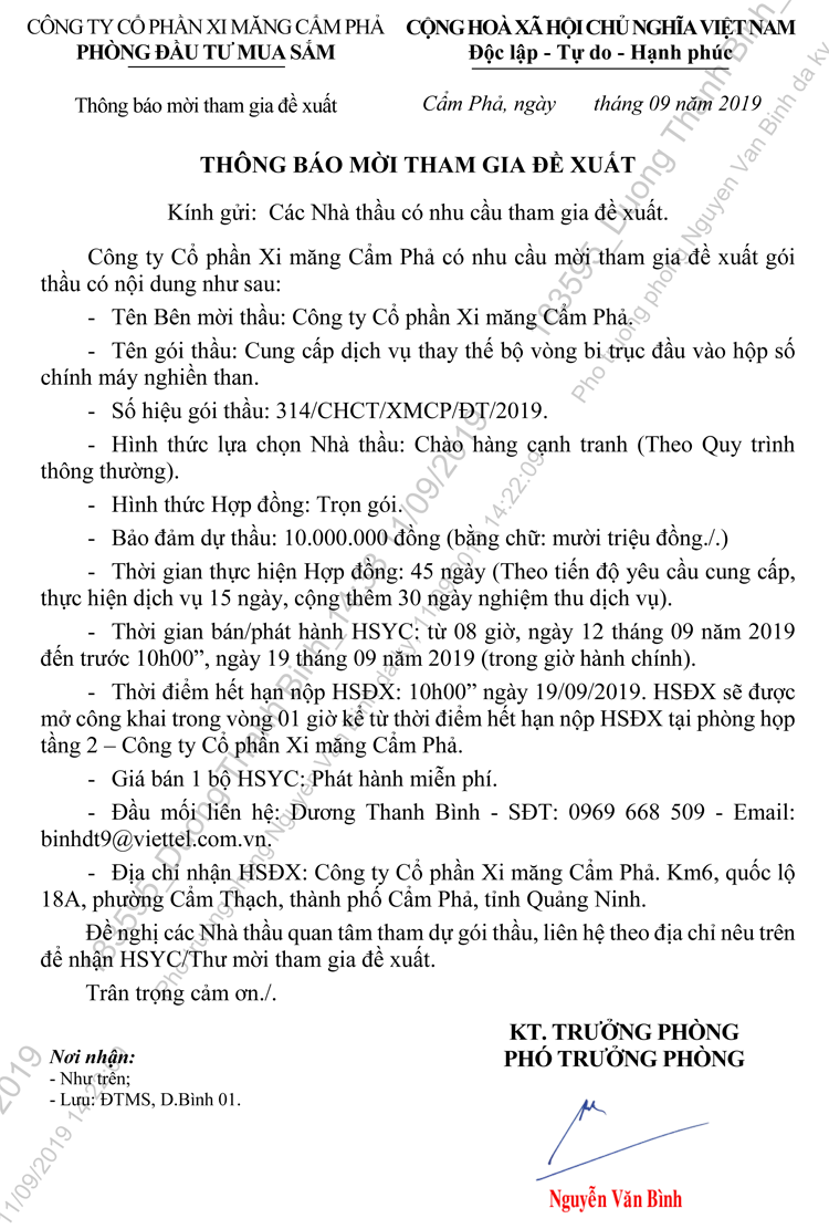 Thông báo mời tham gia đề xuất Cung cấp dịch vụ thay thế bộ vòng bi trục đầu vào hộp số chính máy nghiền than