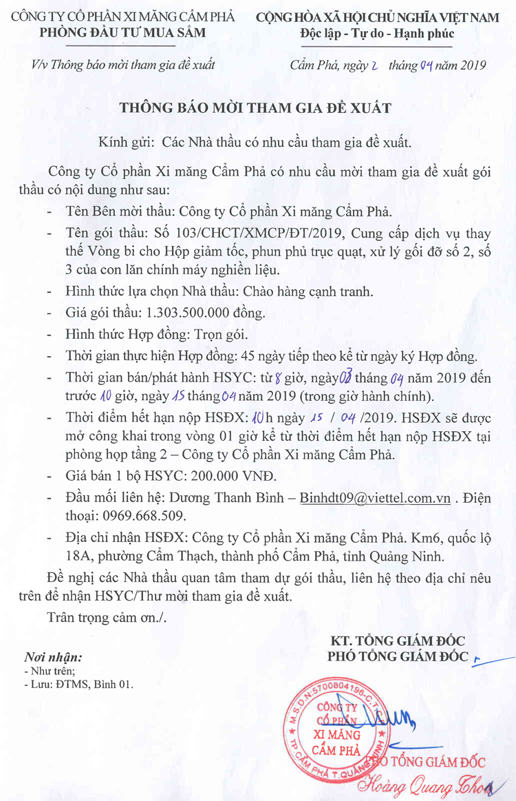 Thông báo mời tham gia đề xuất cung cấp dịch vụ thay thế vòng bi cho hộp giảm tốc, phun phủ trục quạt, xử lý gối đỡ số 2, số 3 của con lăn chính máy nghiền liệu