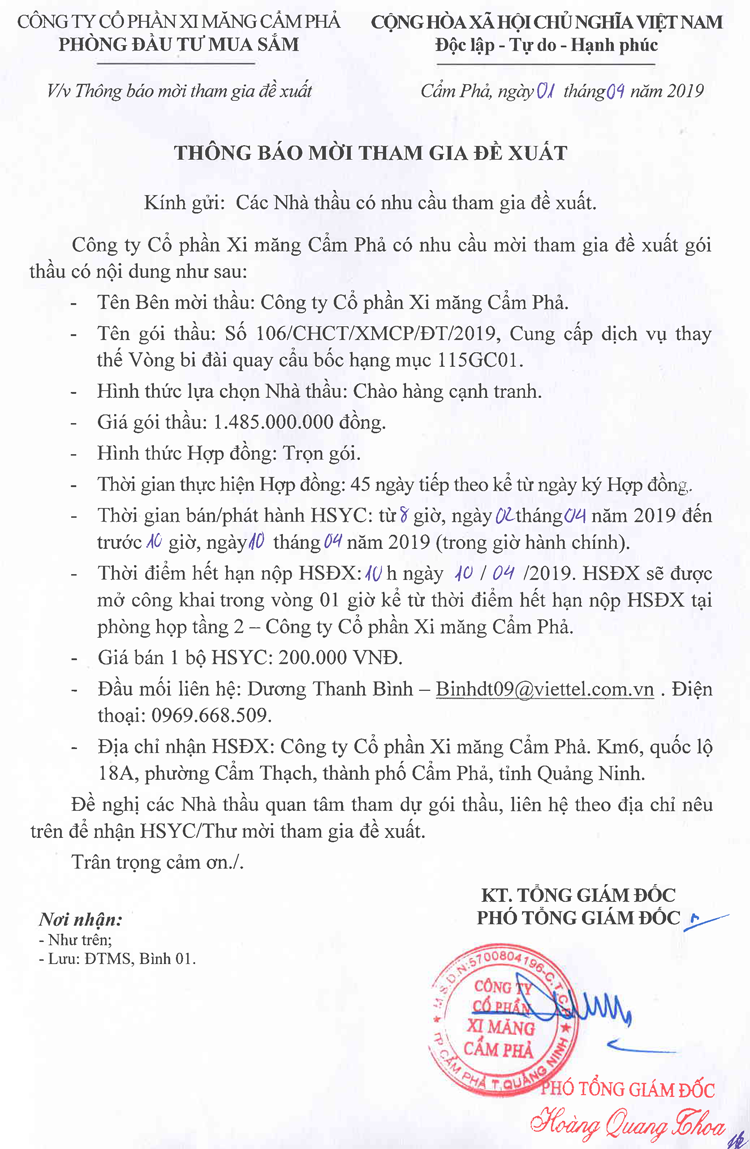 Thông báo mời tham gia đề xuất cung cấp dịch vụ thay thế vòng vi đài quay cẩu bốc hạng mục 115GC01