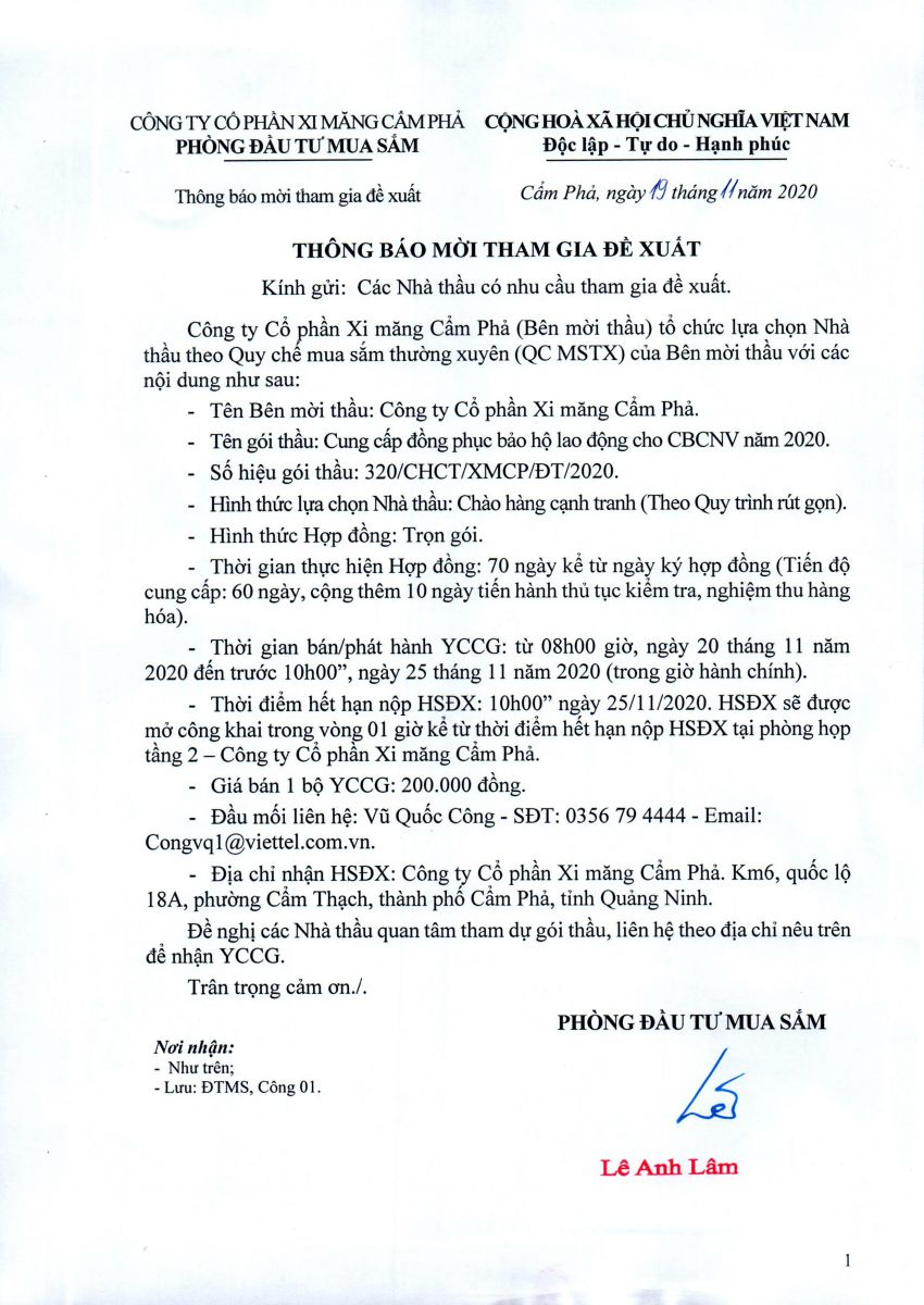 Thông báo mời tham gia đề xuất cung cấp đồng phục bảo hộ lao động cho CBCNV năm 2020