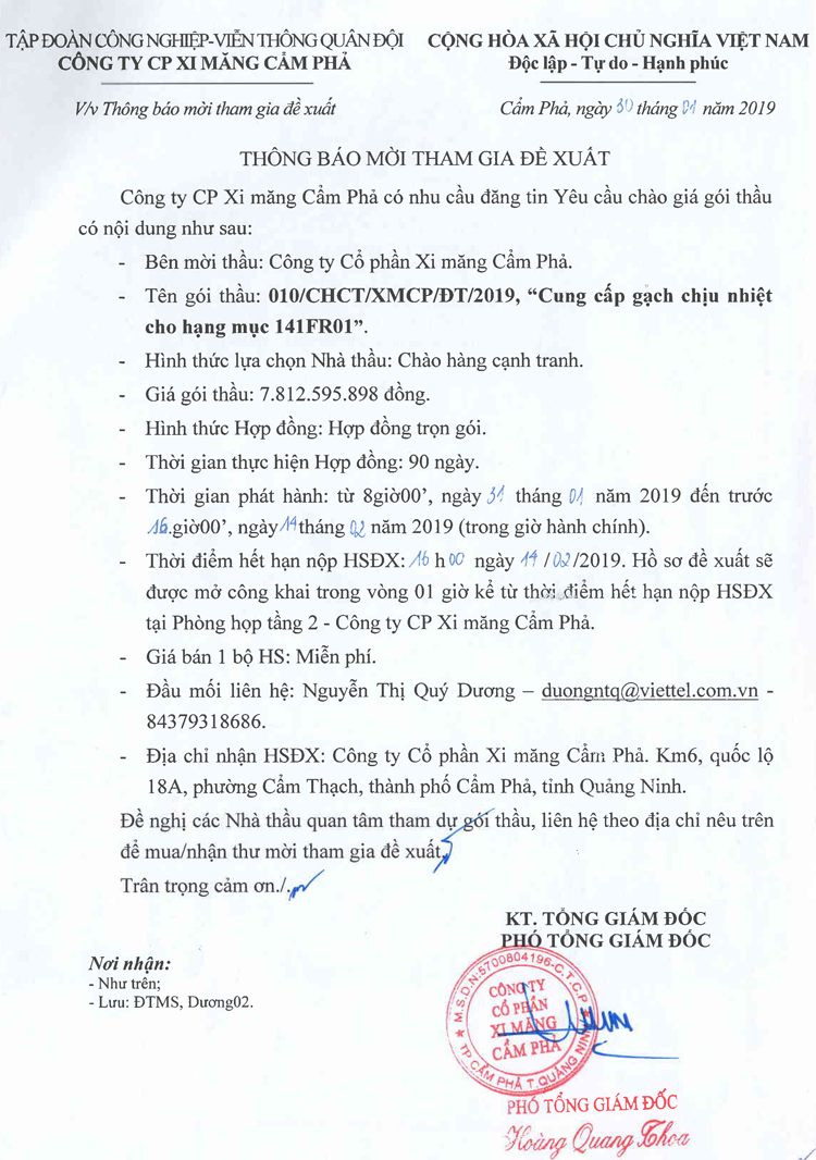 Thông báo mời tham gia đề xuất cung cấp gạch chịu nhiệt cho hạng mục 141FR01