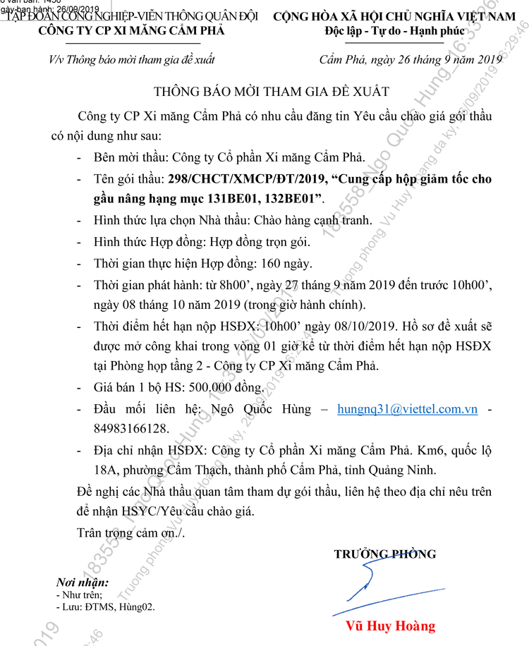 Thông báo mời tham gia đề xuất Cung cấp hộp giảm tốc cho gầu nâng hạng mục 131BE01, 132BE01