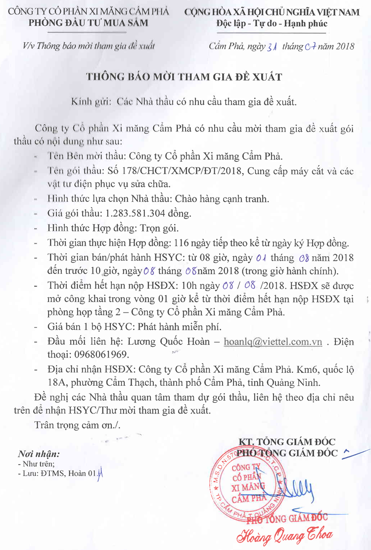 Thông báo mời tham gia đề xuất cung cấp máy cắt và các vật tư điện phục vụ sửa chữa