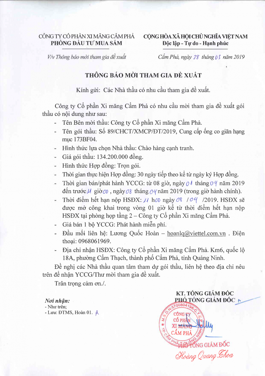 Thông bảo mời tham gia đề xuất cung cấp ống co giãn hạng mục 173BF04