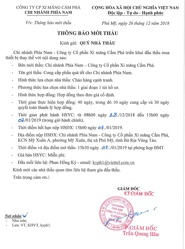 Thông báo mời tham gia đề xuất cung cấp phần quà Tết cho Chi nhánh phía Nam