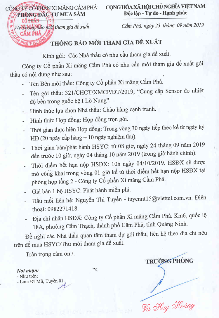Thông báo mời tham gia đề xuất Cung cấp Sensor đo nhiệt độ bên trong duốc bệ I Lò Nung