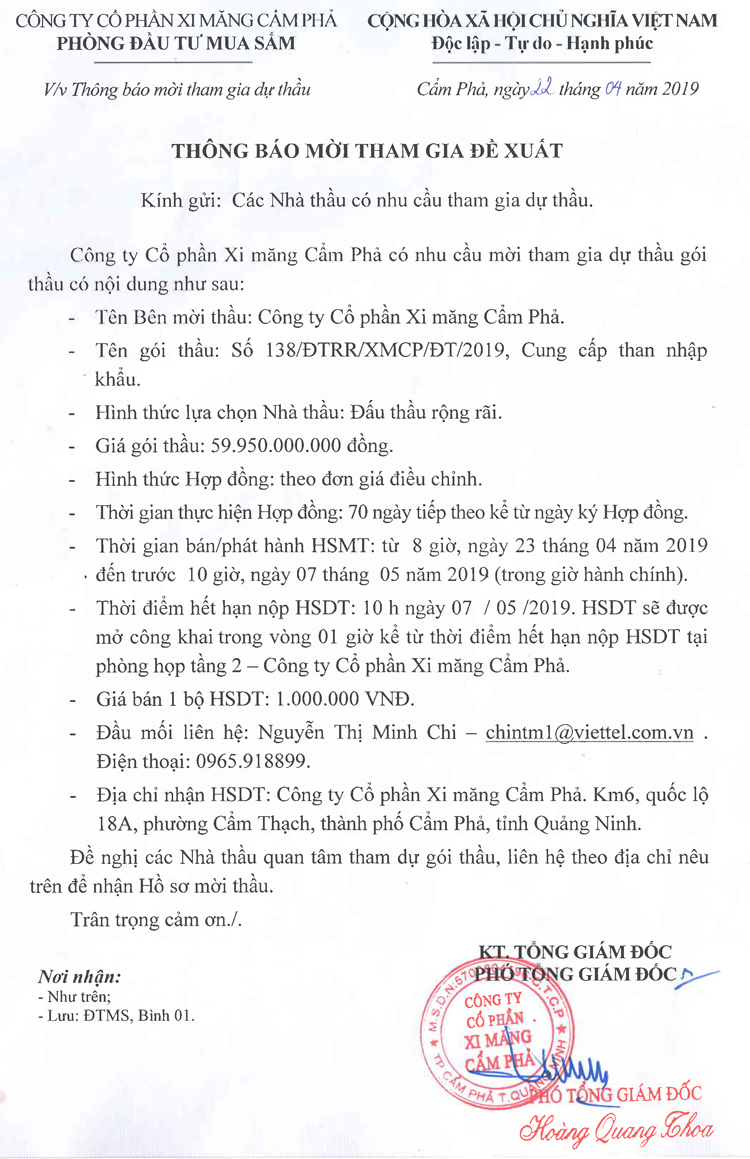Thông báo mời tham gia đề xuất cung cấp than nhập khẩu