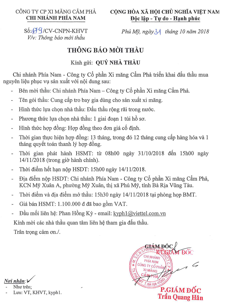 Thông báo mời tham gia đề xuất cung cấp tro bay phục vụ sản xuất xi măng tại Chi nhánh phía Nam