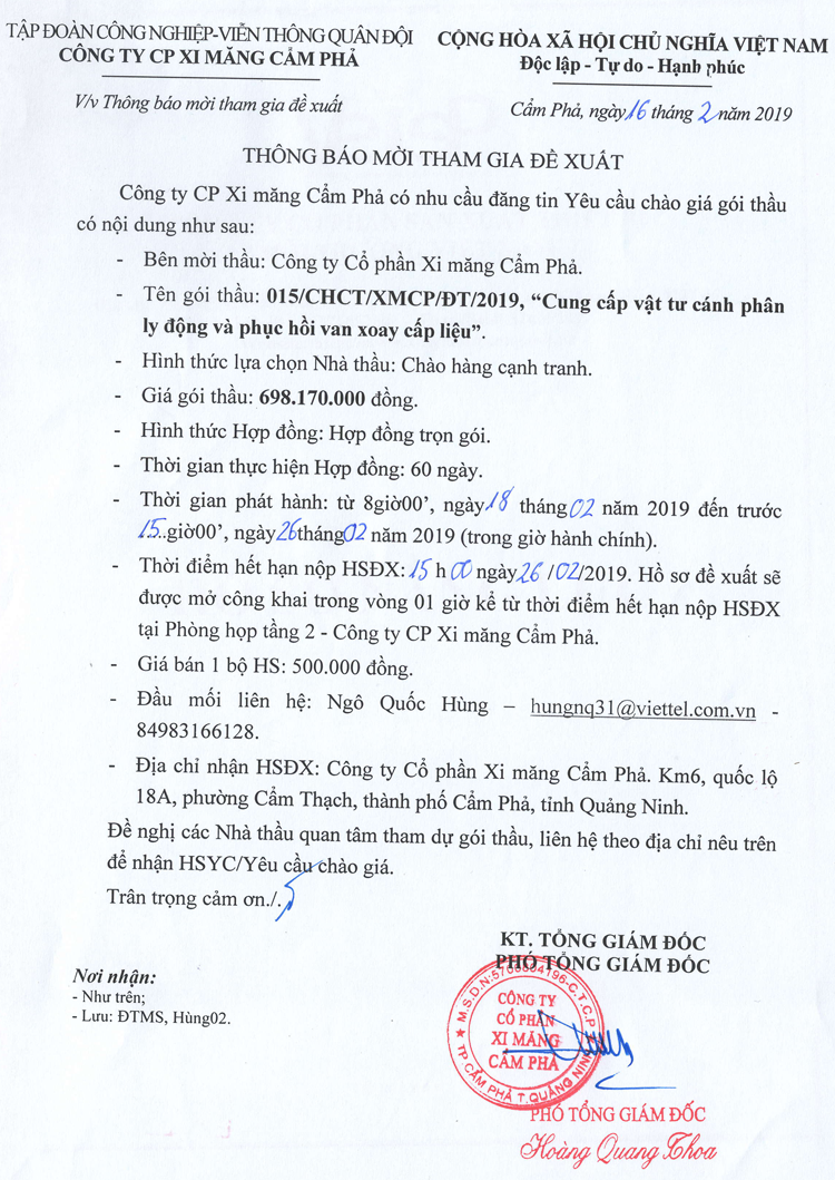 Thông báo mời tham gia đề xuất cung cấp vật tư cánh phân ly động và phục hồi van xoay cấp liệu