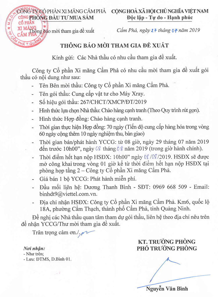 Thông báo mời tham gia đề xuất Cung cấp vật tư cho máy Xray