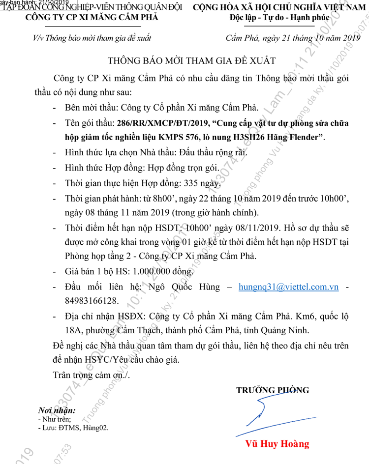 Thông báo mời tham gia đề xuất Cung cấp vật tư dự phòng sửa chữa hộp giảm tốc nghiền liệu KMPS 576, lò nung H3SH26 hãng Flender