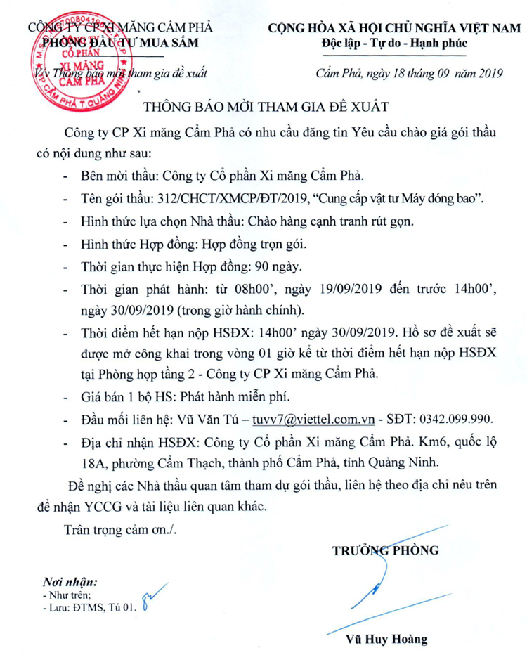 Thông báo mời tham gia đề xuất Cung cấp vật tư máy đóng bao