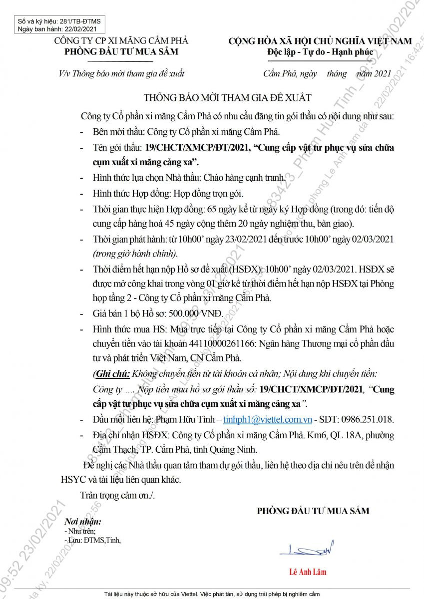 Thông báo mời tham gia đề xuất cung cấp vật tư phục vụ sửa chữa cụm xuất xi măng cảng xa