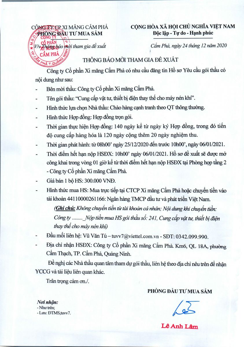 Thông báo mời tham gia đề xuất cung cấp vật tư, thiết bị điện thay thế cho máy nén khí