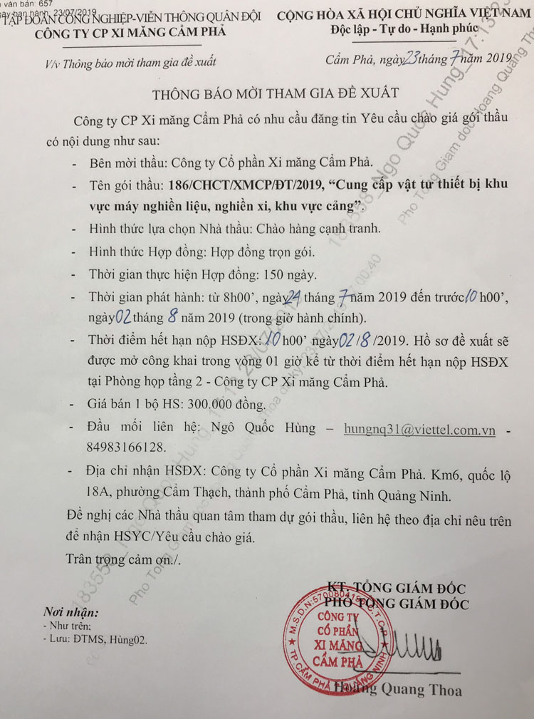 Thông báo mời tham gia đề xuất Cung cấp vật tư thiết bị khu vực máy nghiền liệu, nghiền xi, khu vực cảng