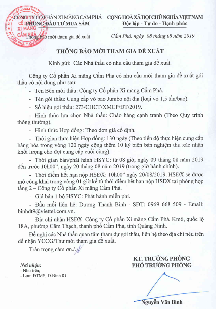 Thông báo mời tham gia đề xuất Cung cấp vỏ bao Jumbo nội địa (loại vỏ 1,5 tấn/bao)
