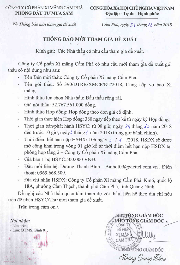 Thông báo mời tham gia đề xuất cung cấp vỏ bao xi măng