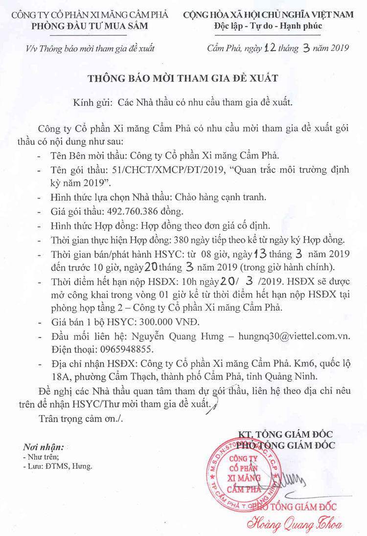 Thông báo mời tham gia đề xuất Quan trắc môi trường định kỳ năm 2019