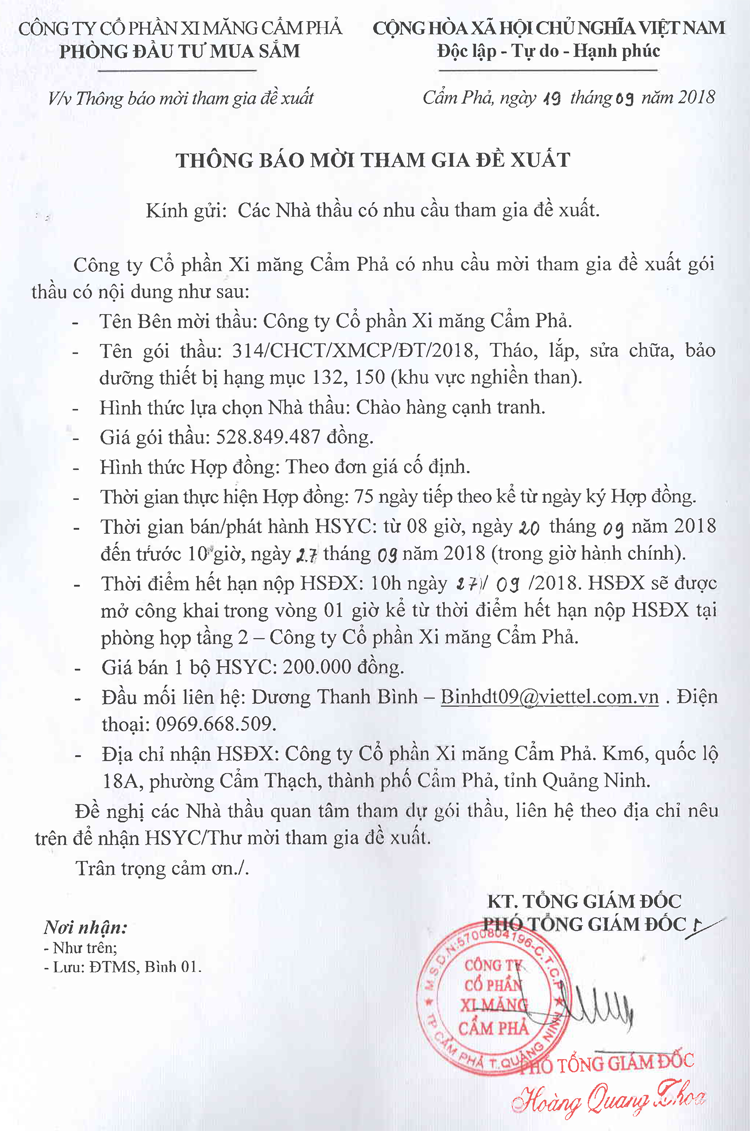Thông báo mời tham gia đề xuất tháo lắp, sửa chữa, bảo dưỡng thiết bị hạng mục 131, 150