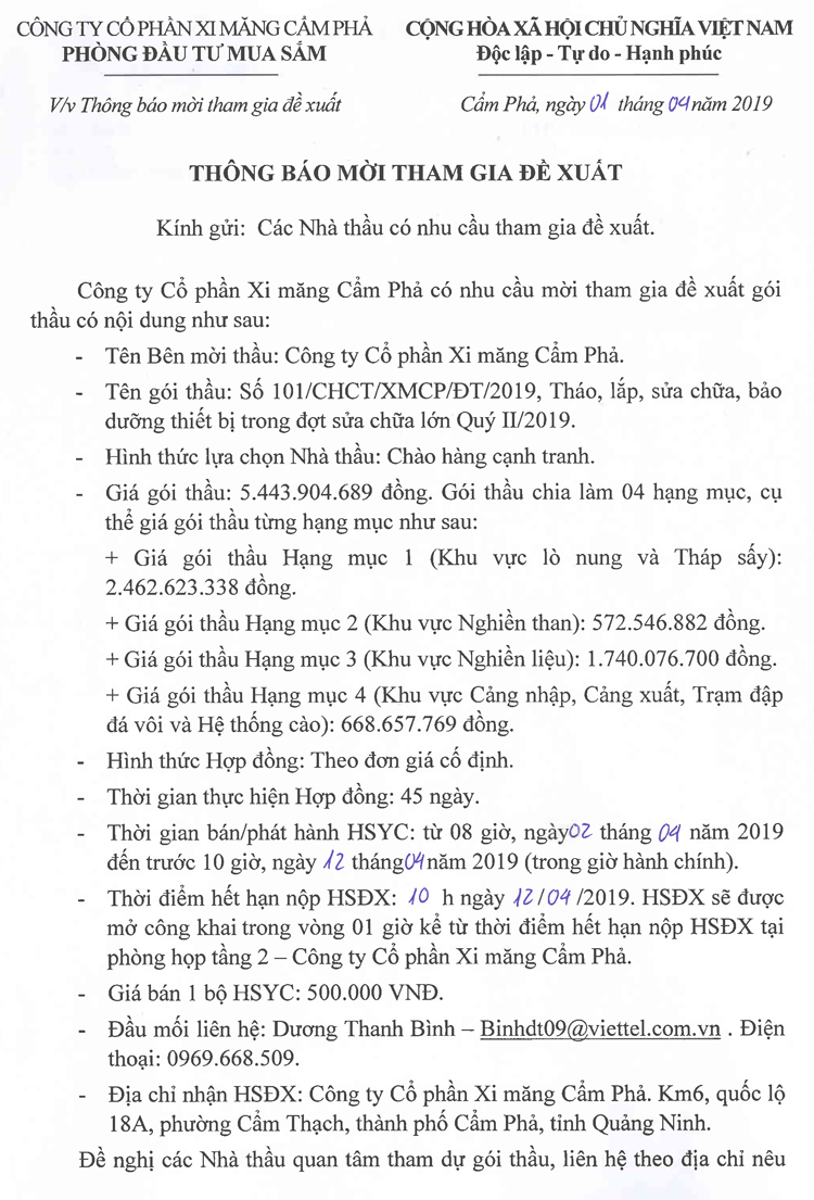 Thông báo mời tham gia đề xuất tháo lắp, sửa chữa, bảo dưỡng thiết bị trọng đợt sửa chữa lớn Quý II/2019