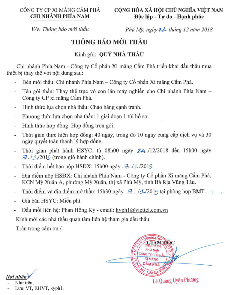 Thông báo mời tham gia đề xuất thay thế trục vỏ con lăn máy nghiền cho Chi nhánh phía Nam