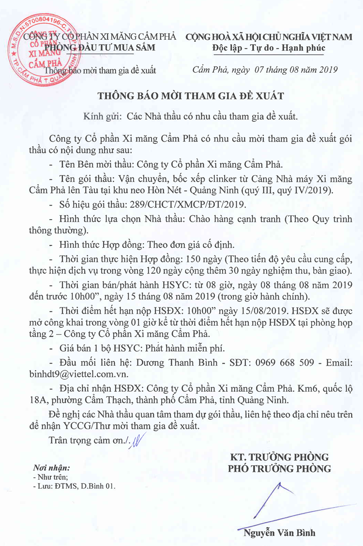 Thông báo mời tham gia đề xuất Vận chuyển, bốc xếp clinker từ Cảng Nhà máy Xi măng Cẩm Phả lên tàu tại khu neo Hòn Nét - Quảng Ninh