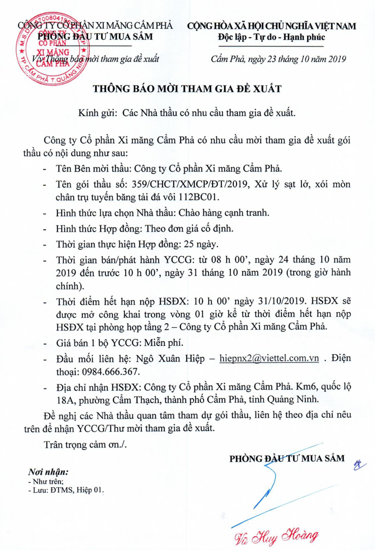 Thông báo mời tham gia đề xuất Xử lý sạt lở, chân trụ tuyến băng tải đá vôi 112BC01