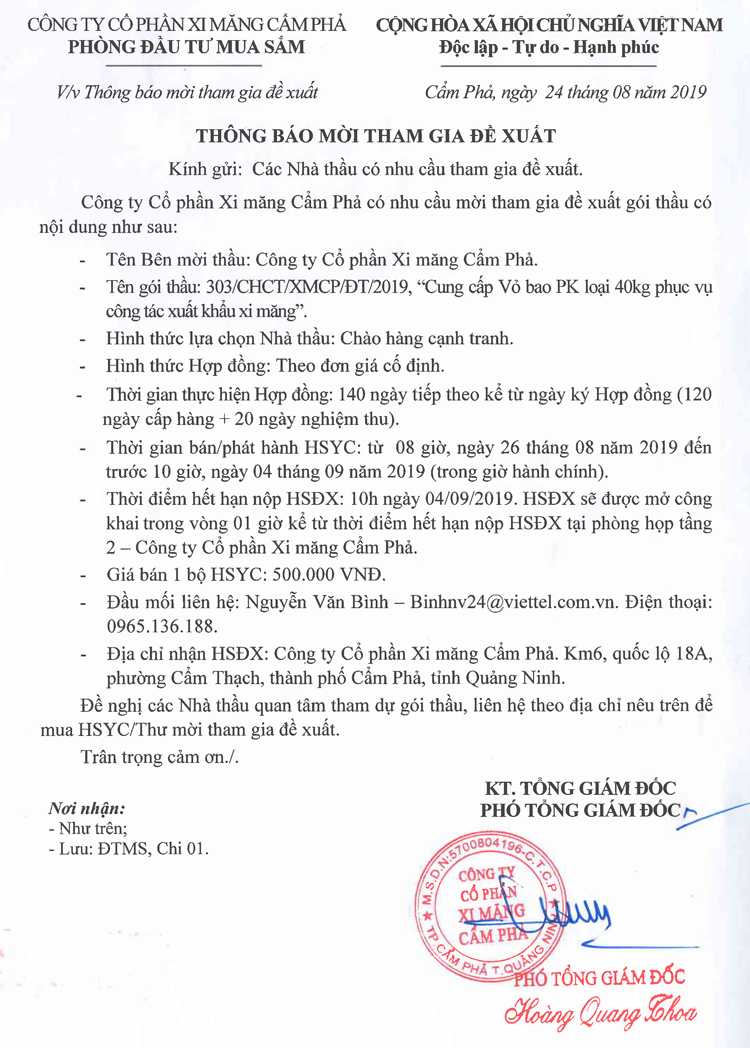 Thông báo tham gia đề xuất Cung cấp vỏ bao PK loại 40kg phục vụ công tác xuất khẩu xi măng