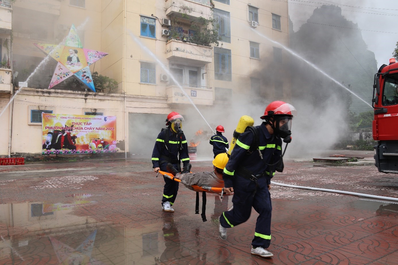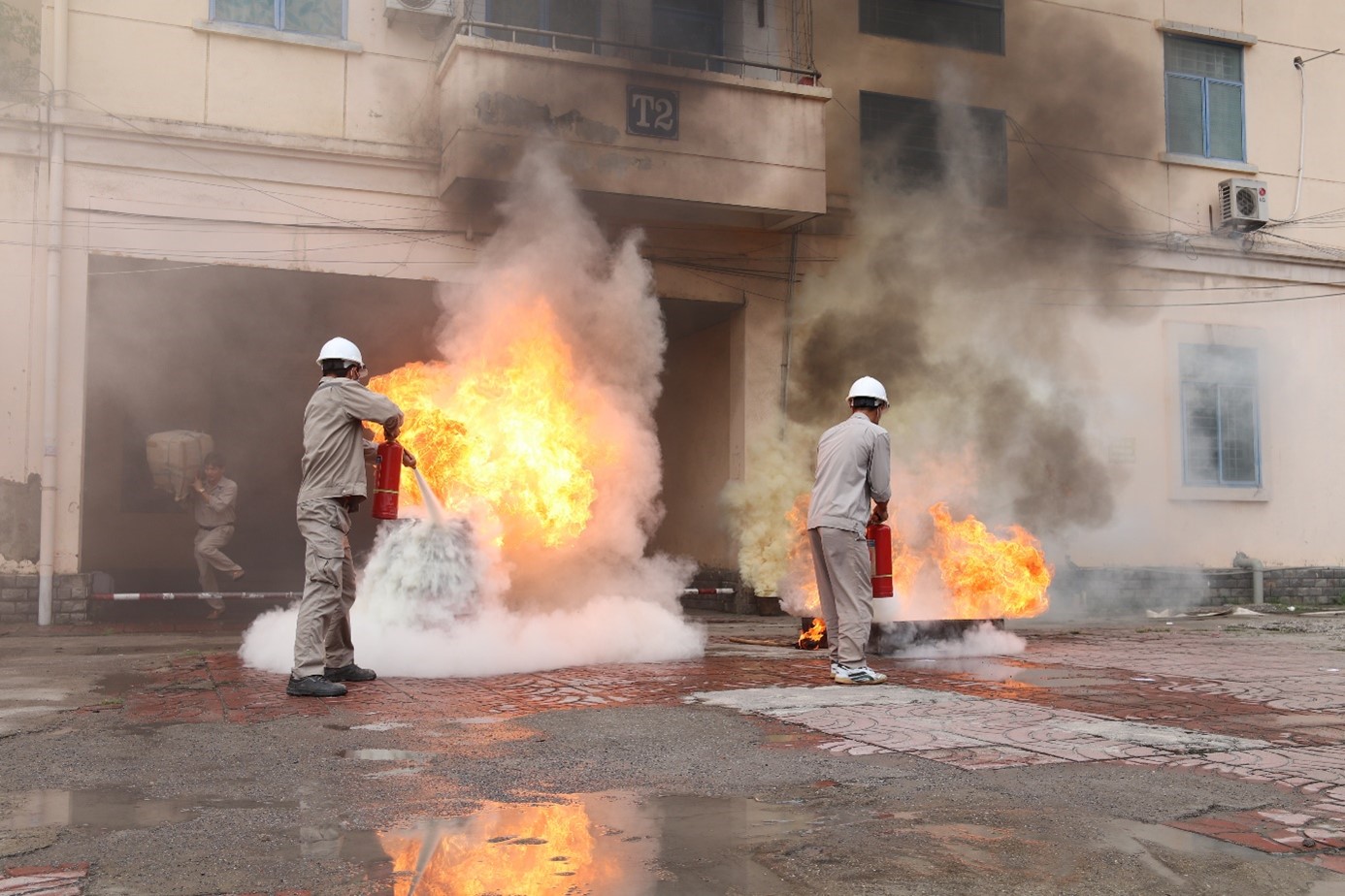 Triển khai thực tập phương án chữa cháy với tình huống giả định “Xảy ra cháy tại tầng 4 nhà tập thể CBCNV của Công ty”. Nguyên nhân cháy do chập điện. Đám cháy nhanh chóng phát triển lan theo bề mặt chất cháy (chất cháy chủ yếu là vải, gỗ, nhựa từ các đồ dùng thiết bị sinh hoạt), nhiệt độ đám cháy tăng cao, tỏa ra nhiều khói khí độc bao trùm toàn căn phòng và khu vực hành lang phía bên ngoài. Trong quá trình thoát nạn chen lấn xô đẩy khiến 02 người bị thương không đi lại được tại tầng 4.